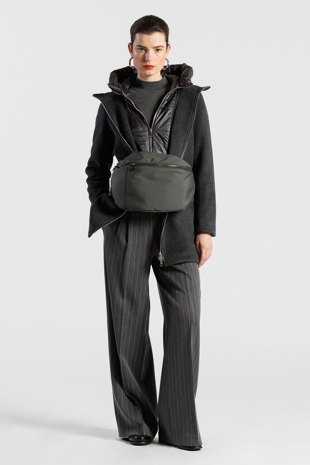 Un nuovo cappotto arricchito da dettagli in nylon imbottito, caldo e performante. La pettorina staccabile, con cappuccio, amplia la possibilità di outfit di questo outwear, ideale per tutto l'inverno. Vestibilità diritta, lunghezza sotto bacino, chiusura con zip e tirazip logato. Pettorina imbottita staccabile con lampo.