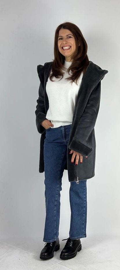 Ecomontone di DIANA GALLESI nel colore grigio scuro. Caban in jersey dal finish vellutato accoppiato con tessuto in materiale morbido, chiusura centrale con zip intera, due tasconi con pelliccia ecologica sul davanti, maniche risvoltate con pelliccia ecologica. Vestibilità regular. Il caban accompagna i movimenti con leggerezza e comfort. Da indossare come un abbraccio urbano, tra passeggiate in città e fughe last minute.