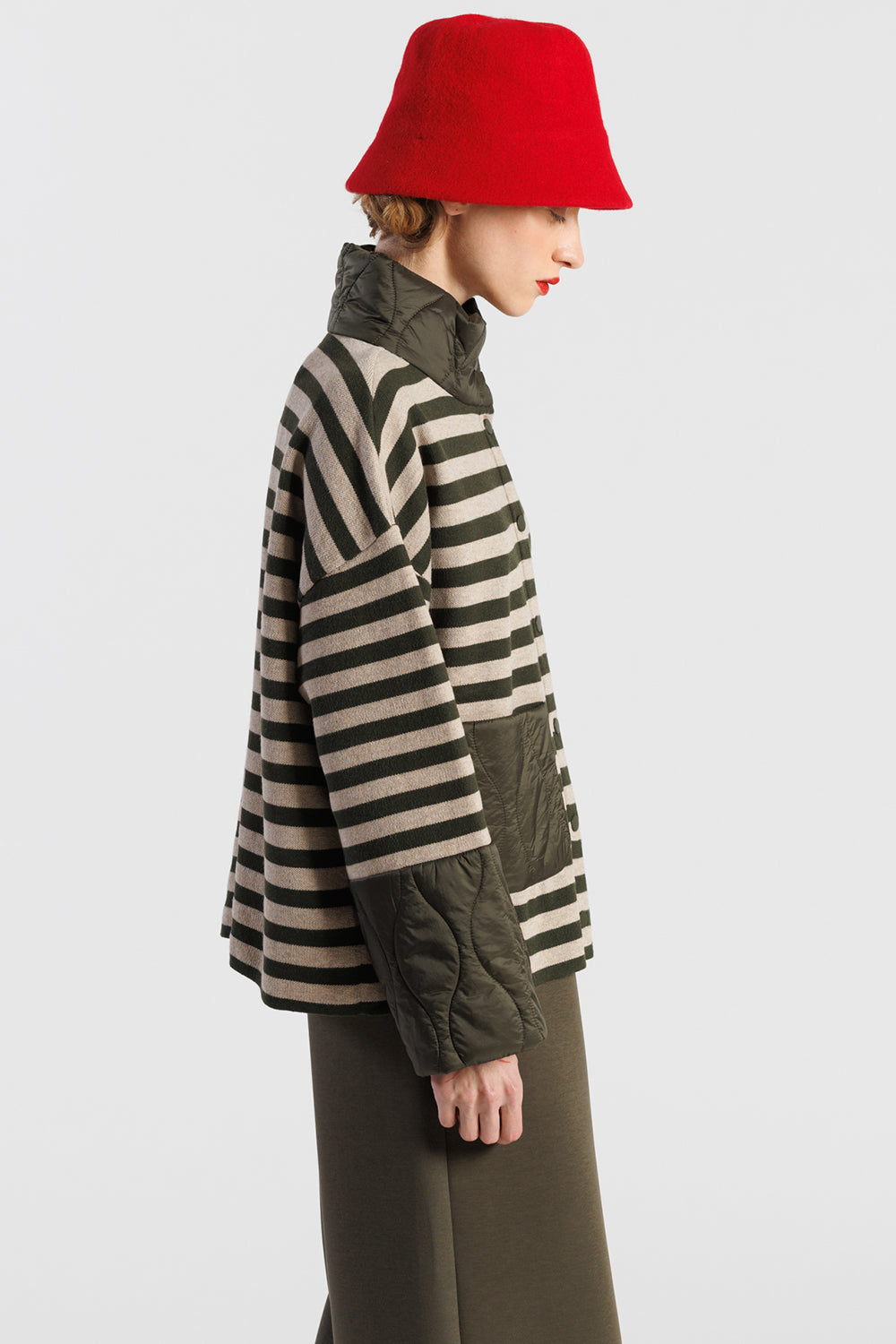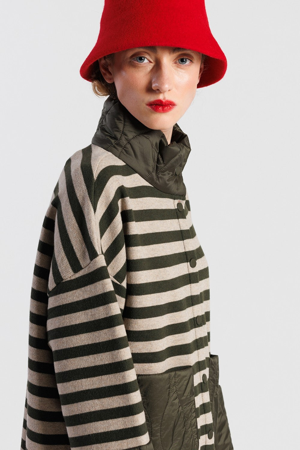 Realizzato in maglia morbida con motivo a righe, si distingue per i dettagli in nylon imbottito su polsi, tasche e collo,che aggiungono un tocco sportivo e contemporaneo e rendono il capo sfruttabile anche come capo spalla per i primi freddi. Il taglio corto e versatile lo rende ideale per accompagnarti nelle giornate più dinamiche, mentre la combinazione di materiali offre un piacevole contrasto tra comfort e praticità. Vestibilità leggermente svasata, spalla scesa. Collo,polsi e tasche con leggera imbottitura. Bottoni automatici smaltati. Filato 5% di lana.