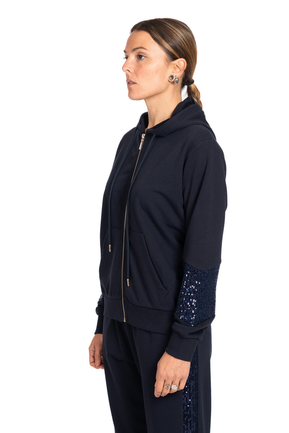 Jogger in felpa con 2 tasche laterali, compatta con fascia elastica in vita e silhouette morbida, illuminato da bande laterali in paillettes tono su tono che aggiungono un effetto brillante e raffinato. Vestibilità regular.