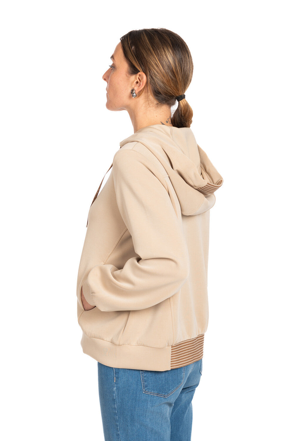 Pantalone ampio con tasche applicate in scuba fluido, in punto Milano con vita elasticata e dettaglio a righe in maglia lurex, che aggiunge un tocco sofisticato al design essenziale e pulito. 2 tasche sul davanti e due tasche dietro. Vestibilità wide leg.