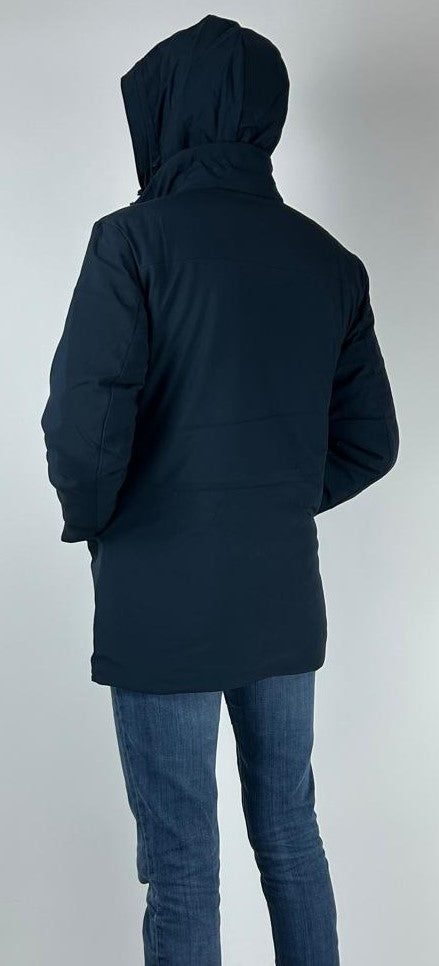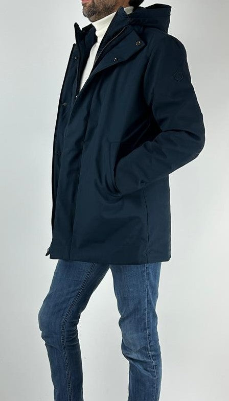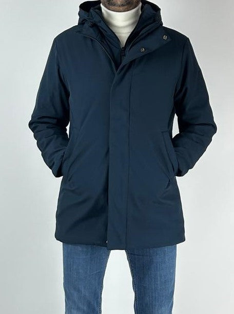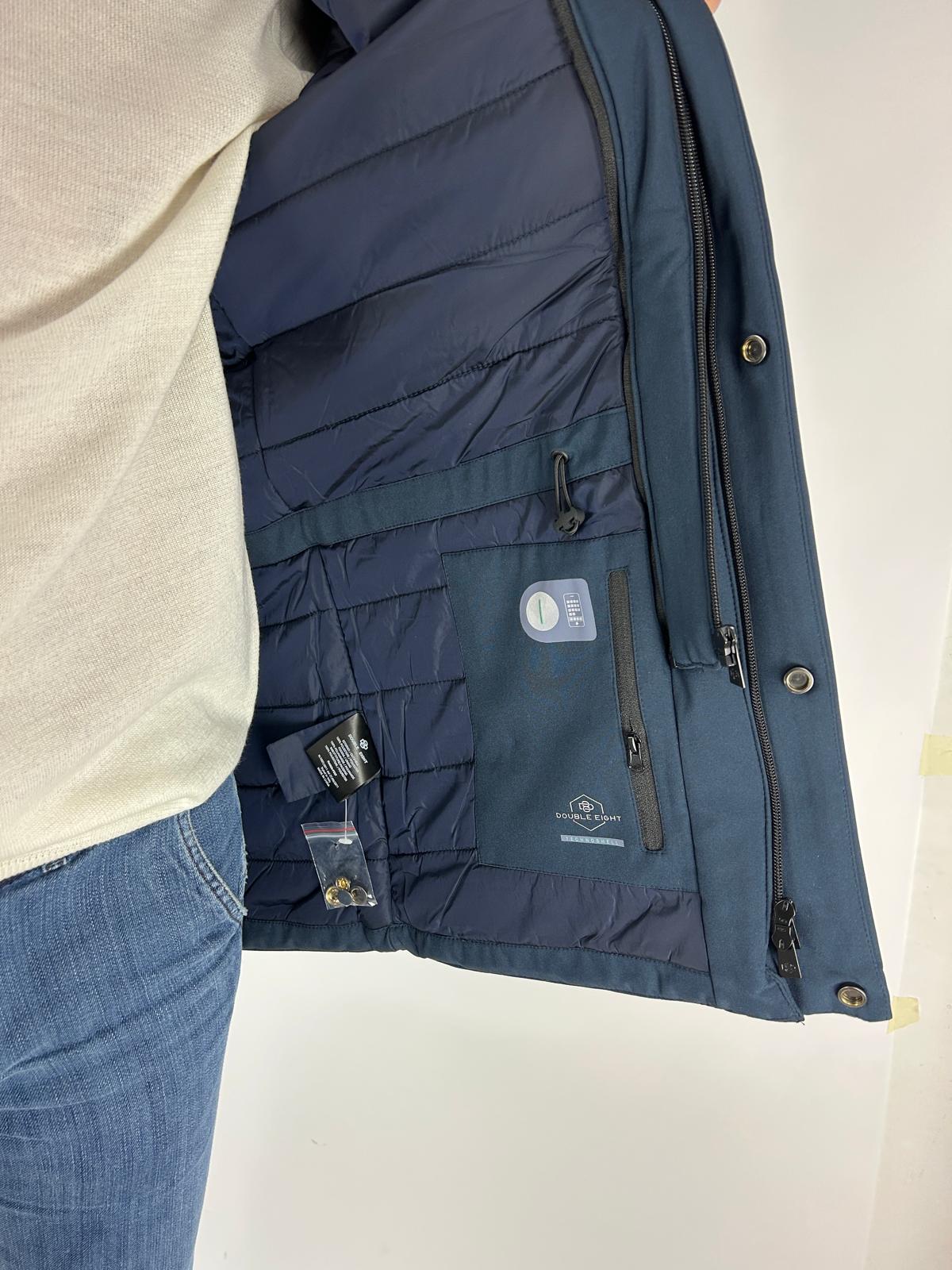 Giaccone DOUBLE EIGHT con interno imbottito nel colore blu notte. Giaccone con chiusura frontale sia con zip che con bottoni, cappuccio removibile e regolabile, due tasche sul davanti con chiusura a clip. Giaccone con pettorina removibile. La vestibilità è regolare. Perfetto da indossare per una giornata in ufficio, per un appuntamento di lavoro, ideale da indossare con un jeans o con un pantalone classico.