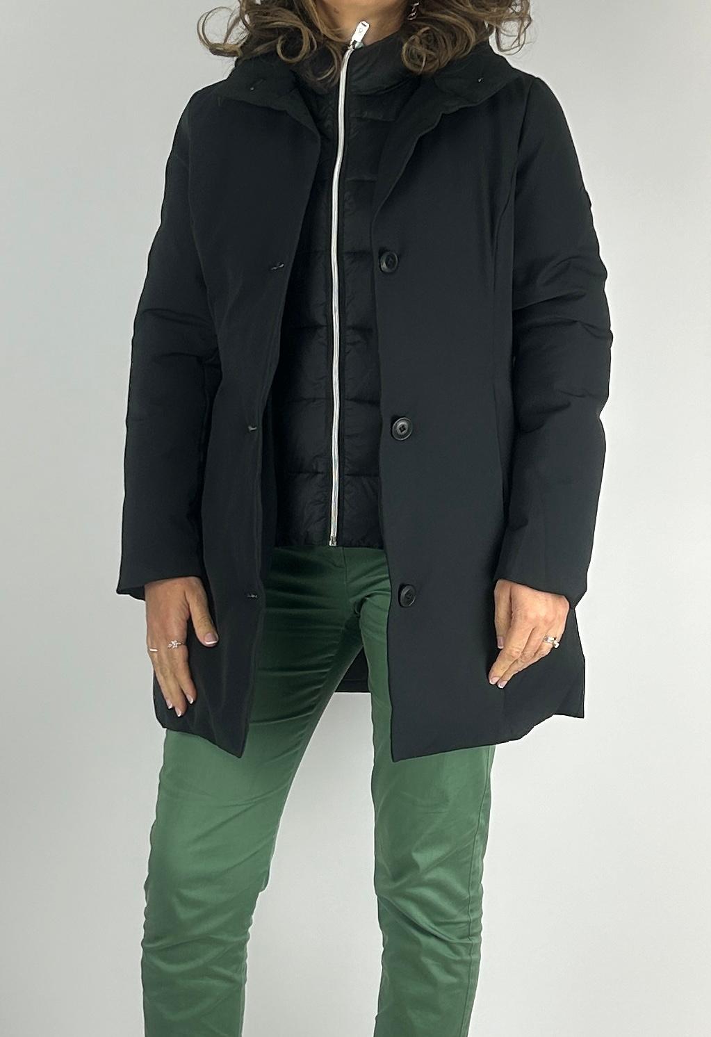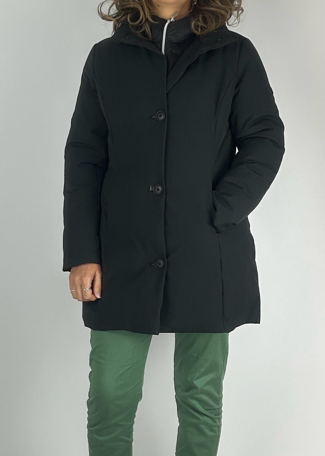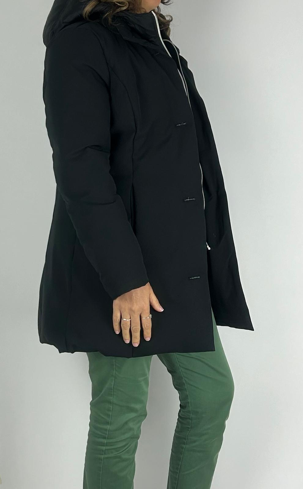 Parka Donna DOUBLE EIGHT nel colore nero con interno imbottito, chiusura frontale sia con i bottoni che con zip. Paravento e cappuccio staccabili interamente. La parte interna è un piumino ovattato perfetto per mantenere il corpo caldo anche nei giorni più freddi. Presenta due tasche laterali a filo a scomparsa. La Vestibilità è regolare. Perfetto da indossare per una giornata in ufficio, per un appuntamento di lavoro, ideale da indossare con un jeans o con un pantalone classico.