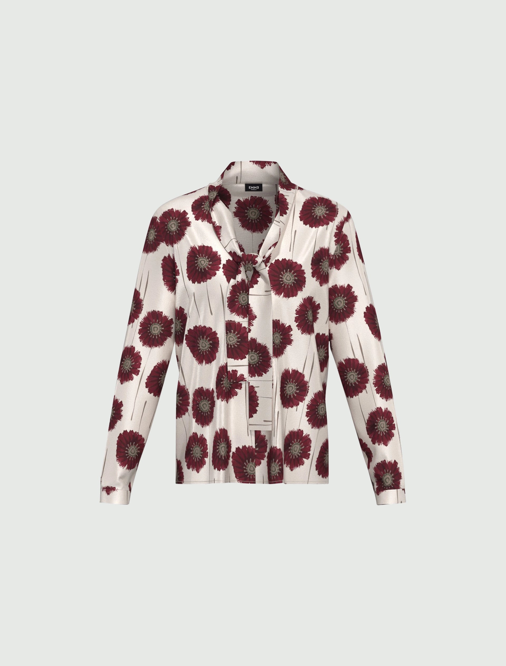Blusa in morbido twill decorato da macro stampa floreale. Luminosa e leggera, si stringe al collo con la sciarpina e crea un immediato flair femminile. Da giocare a contrasto con biker jacket in pelle.