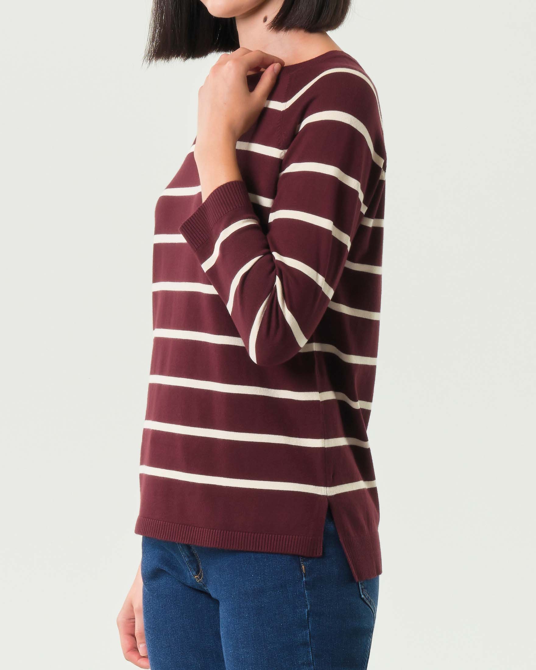 Maglia girocollo di EMME MARELLA nel colore rigato bordeaux e burro. Maglia girocollo in misto viscosa dalla linea dritta con spacchi laterali al fondo. Profili lavorati a costine.