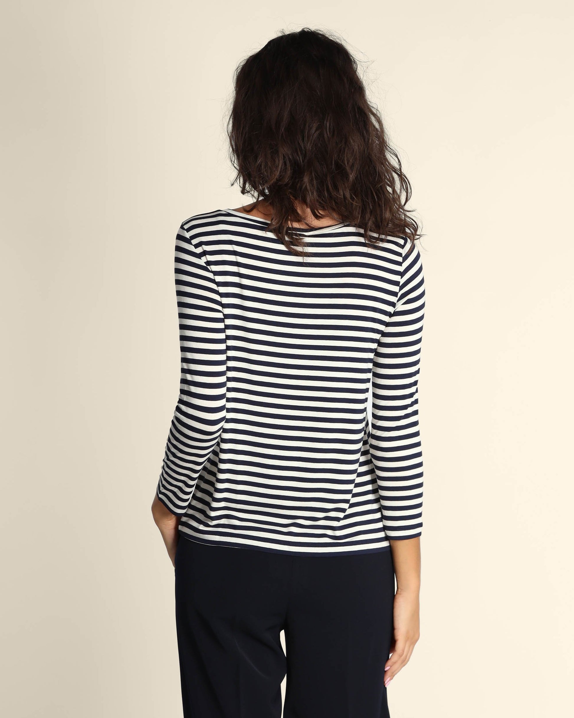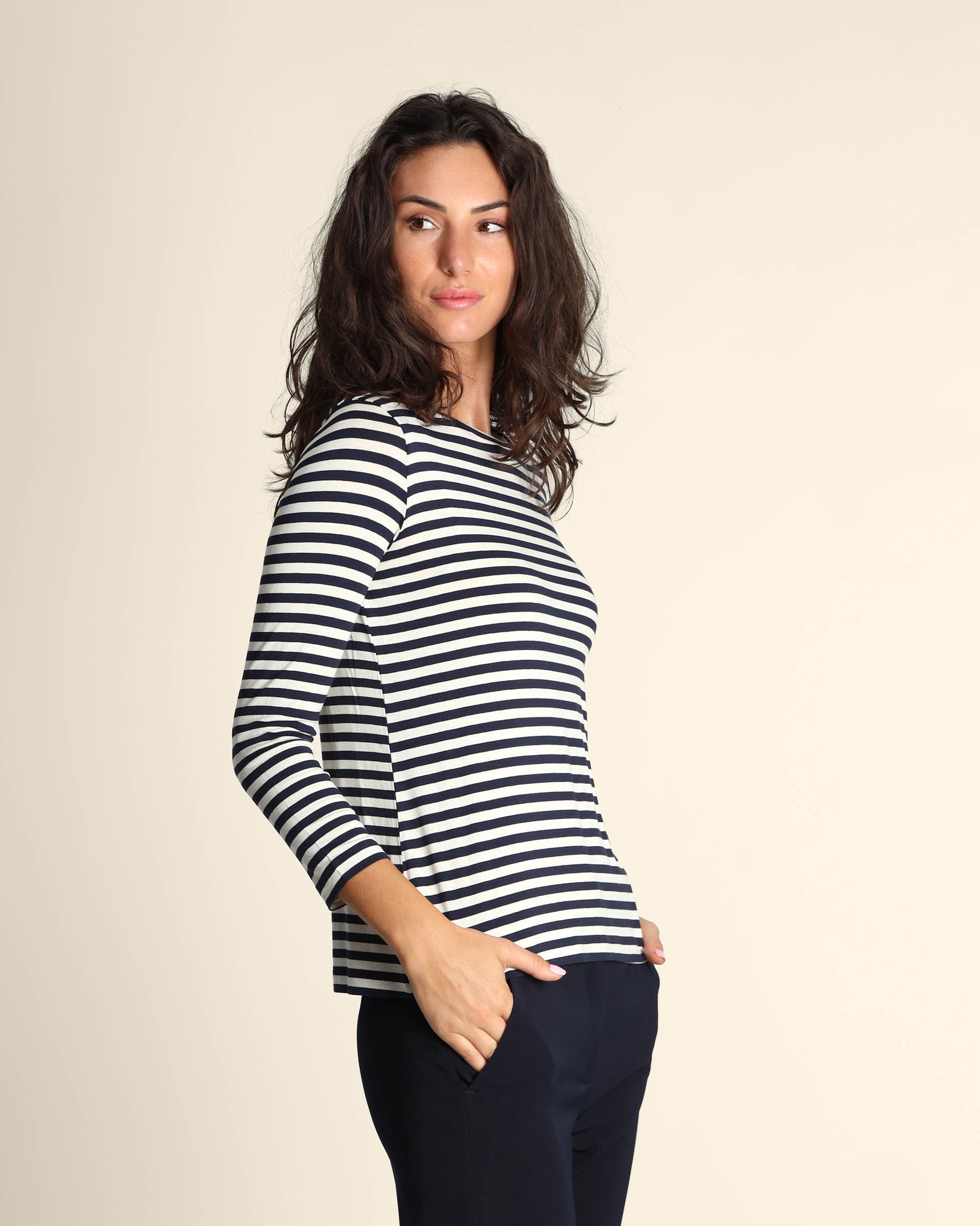 Intramontabile marinère con manica lunga, in jersey stretch per un comfort a fior di pelle. La abbini con un blazer, con i jeans, con una maglia e non sbagli un look.
