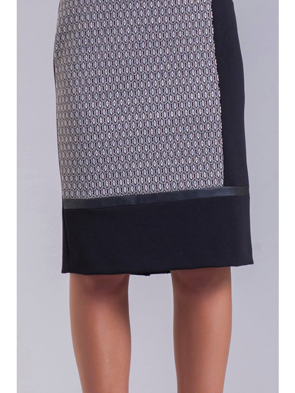 Longuette a vita in elegante tessuto crêpe e jacquard, linea aderente, inserti in ecopelle, spacco e chiusura con lampo invisibile al centro dietro.
