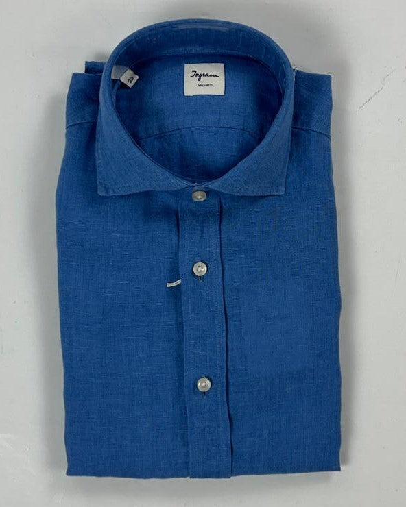 Camicia manica lunga in puro lino della INGRAM nel colore azzurro, collo alla francese, senza tasche, bottoni in madre perla, vestibilità slim.