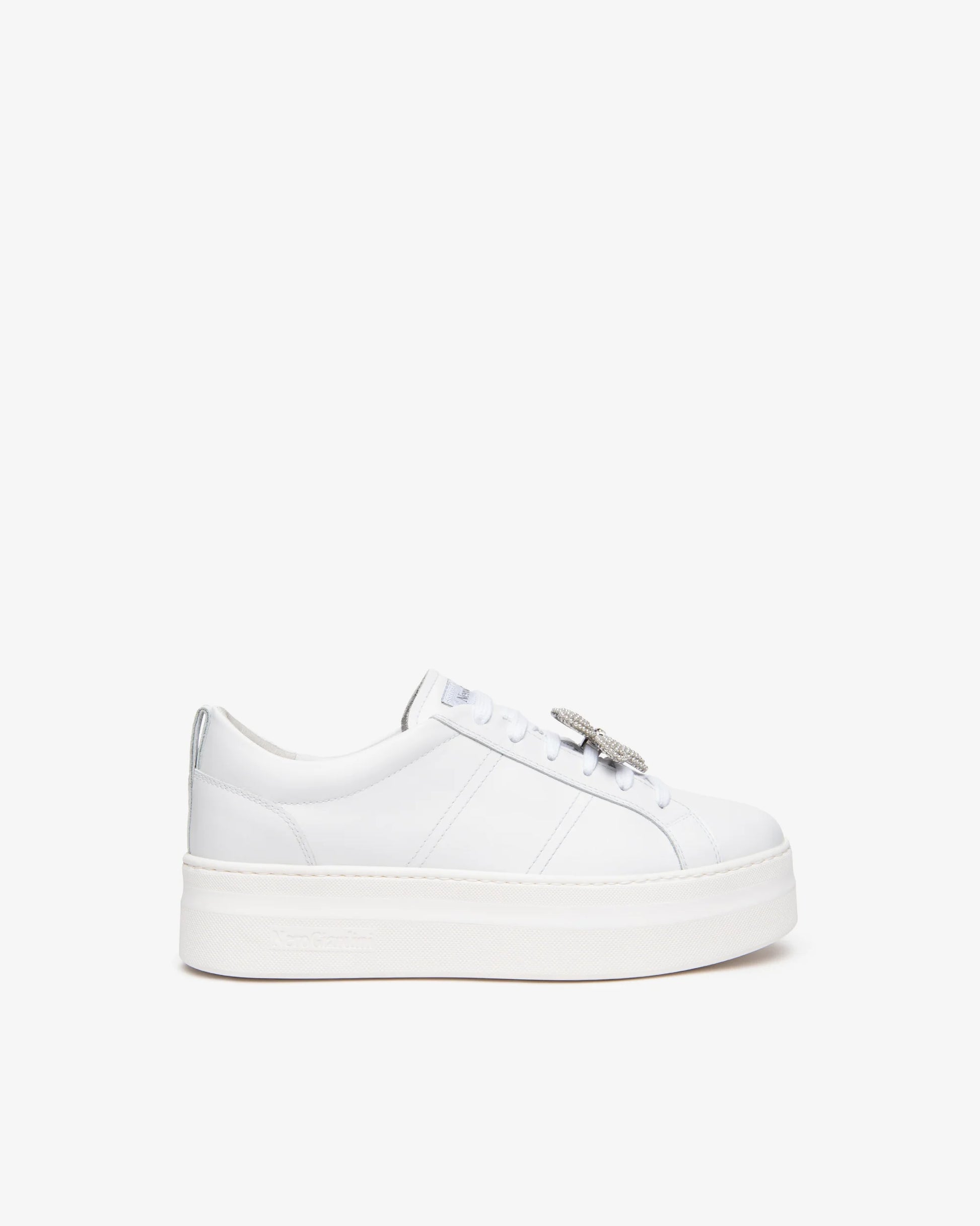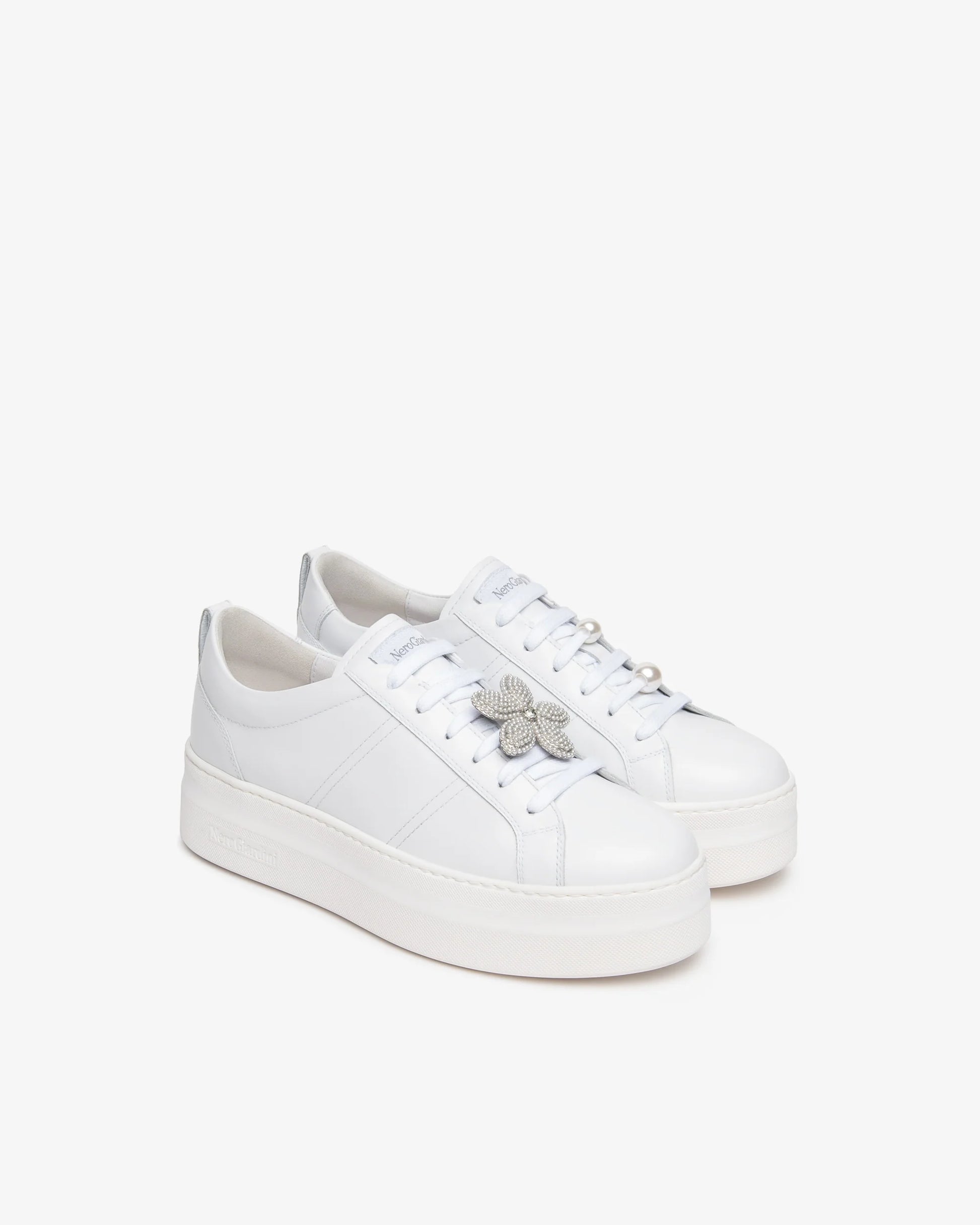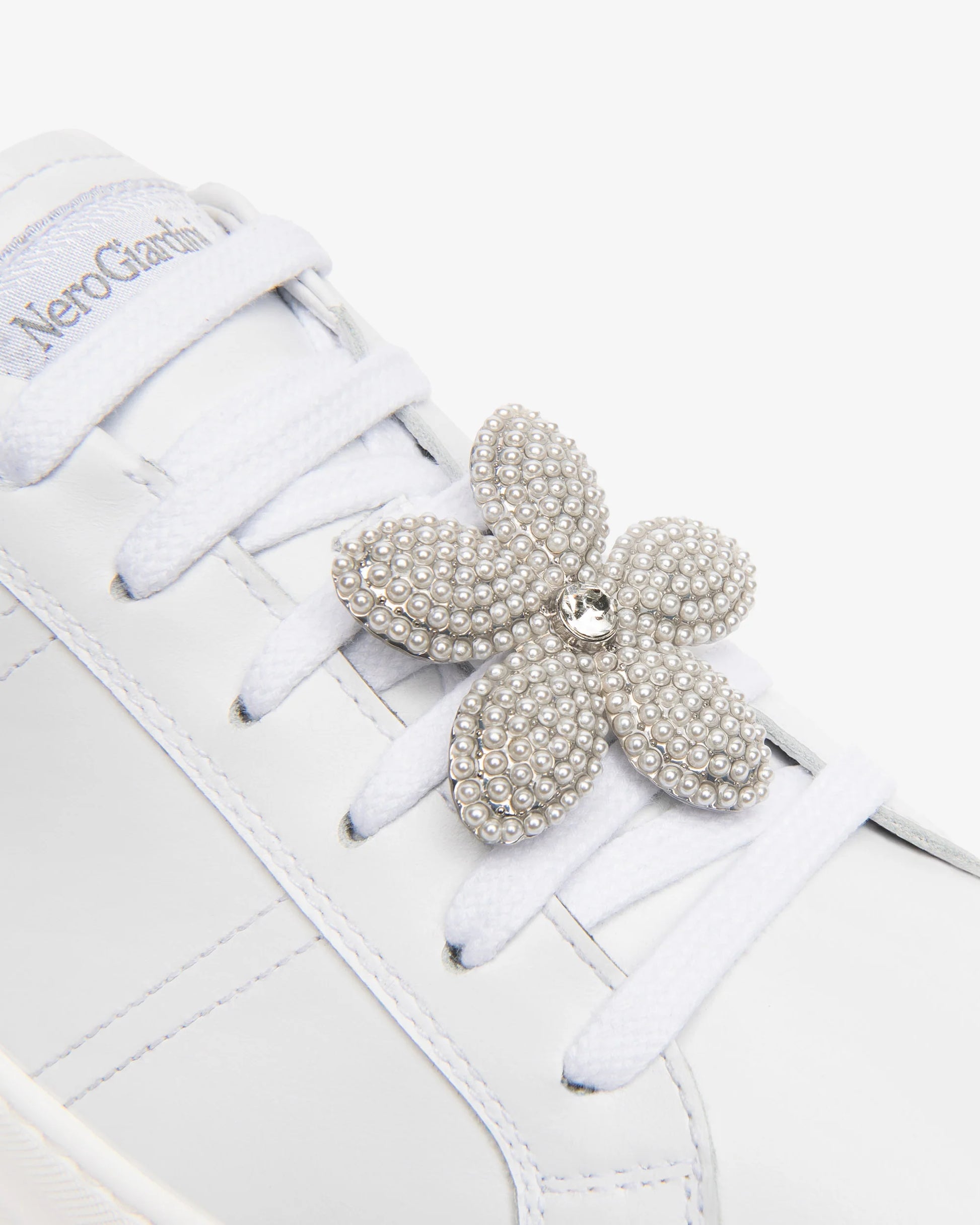 Sneakers in pelle da donna NERO GIARDINI nel colore bianco. Sneakers con allacciatura frontale a 6 fori, para di colore bianco, impreziosita da fiore paillettato removibile.