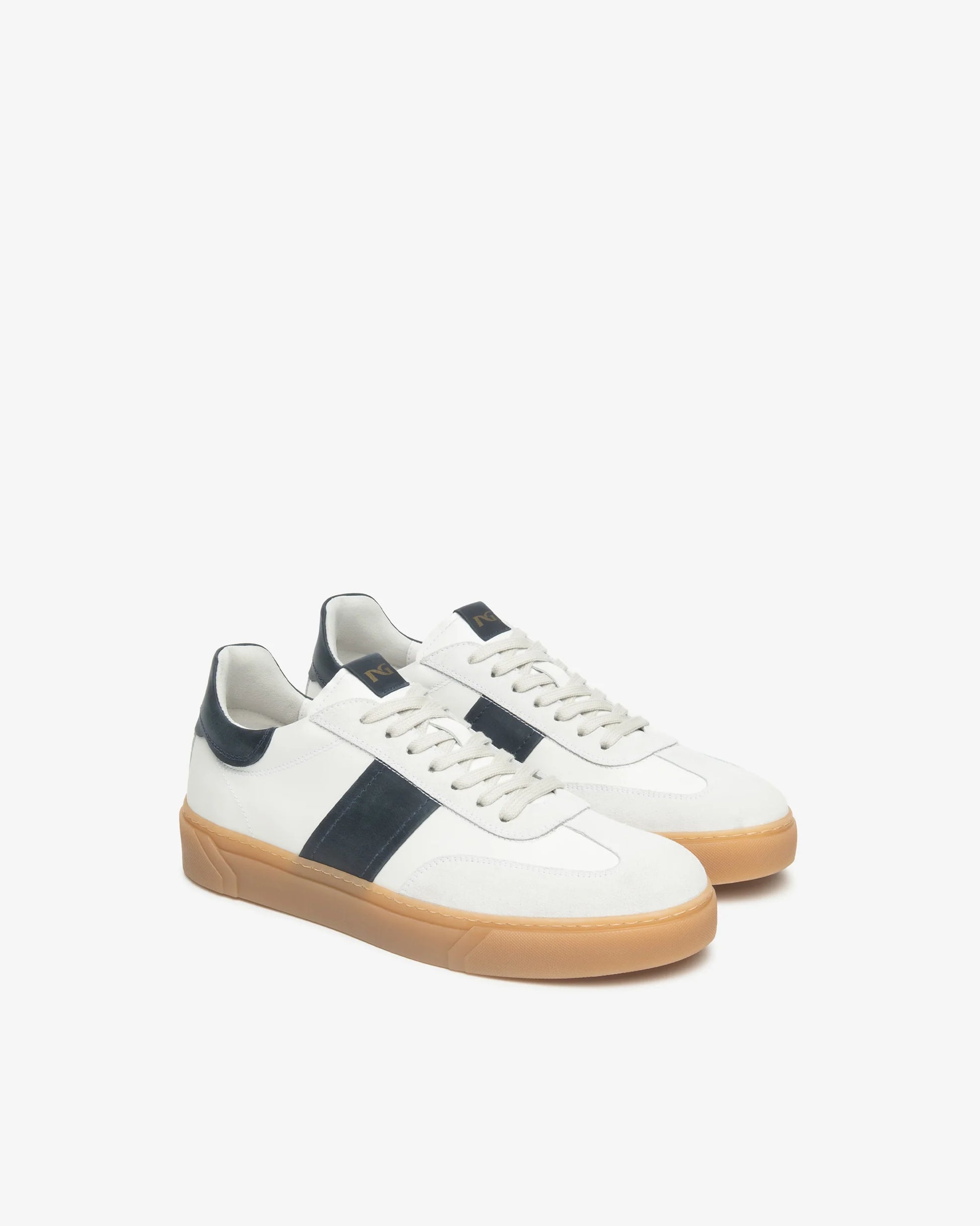 Sneakers in pelle da uomo NERO GIARDINI nel colore bianco con fasce blu. Sneakers con allacciatura frontale a 7 fori, para di colore beige.