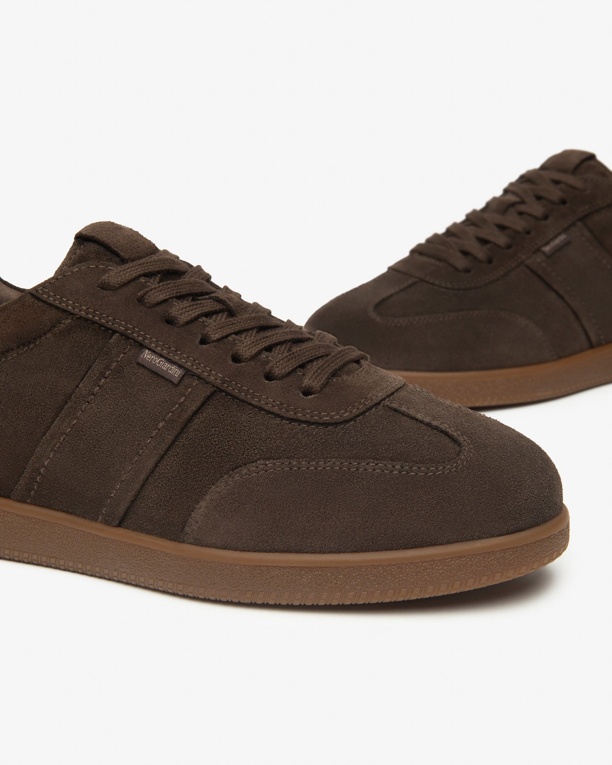 Sneakers in pelle di camoscio da uomo NERO GIARDINI nel colore testa di moro. Sneakers con allacciatura frontale a 7 fori e con para di colore marrone.