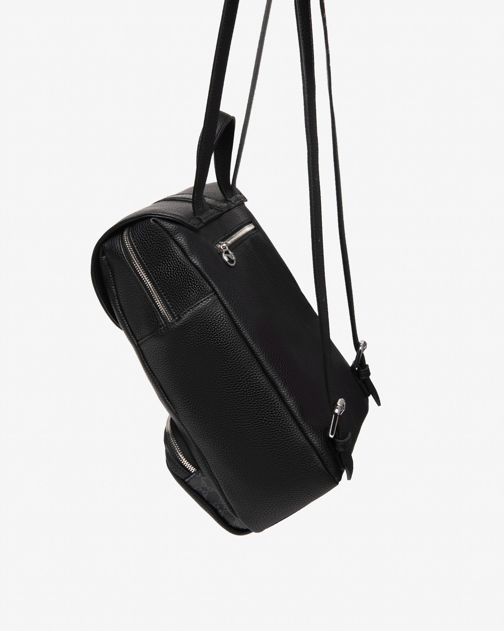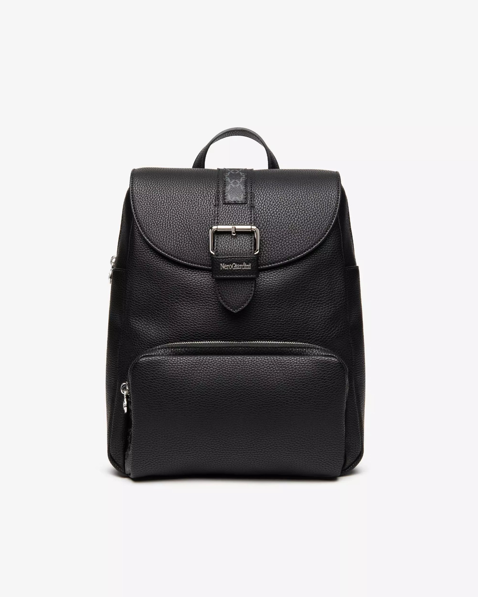 Zainetto da donna della NERO GIARDINI nel colore nero. Zainetto realizzato con materiali tecnici composto da apertura frontale con bottone calamitato, tasca parte anteriore con chiusura a zip, tascone centrale per aprire lo zaino con chiusura a zip, tasca posteriore con chiusura a zip, due tasche interne con chiusura a zip, dotato anche di fodera. Cinturini per regolare la lunghezza dello zaino. Logo "NERO GIARDINI" sulla parte anteriore.