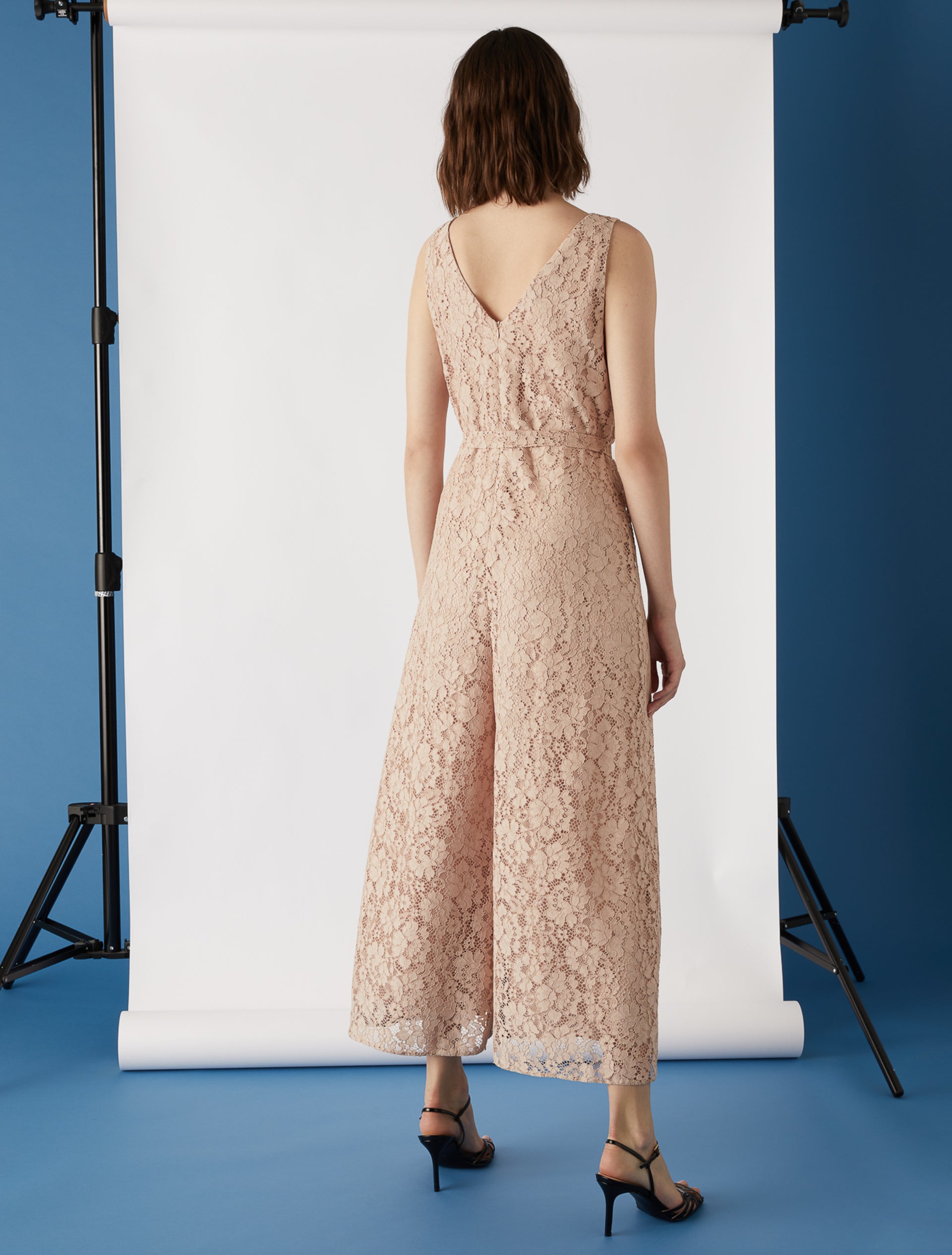 Tuta in pizzo, linea dritta. Scollo a V davanti e dietro, senza maniche.Foderata. Cintura coordinata.