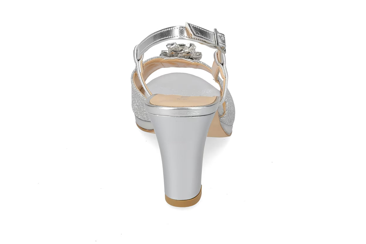 Sandali in pelle da donna di VALLEVERDE nel colore argento. Sandali in pelle con una fascia con pailletter ed accessorio decorativo sul davanti, allacciatura a cinturino regolabile sul retro, sottopiede in pelle, tacco cm.8