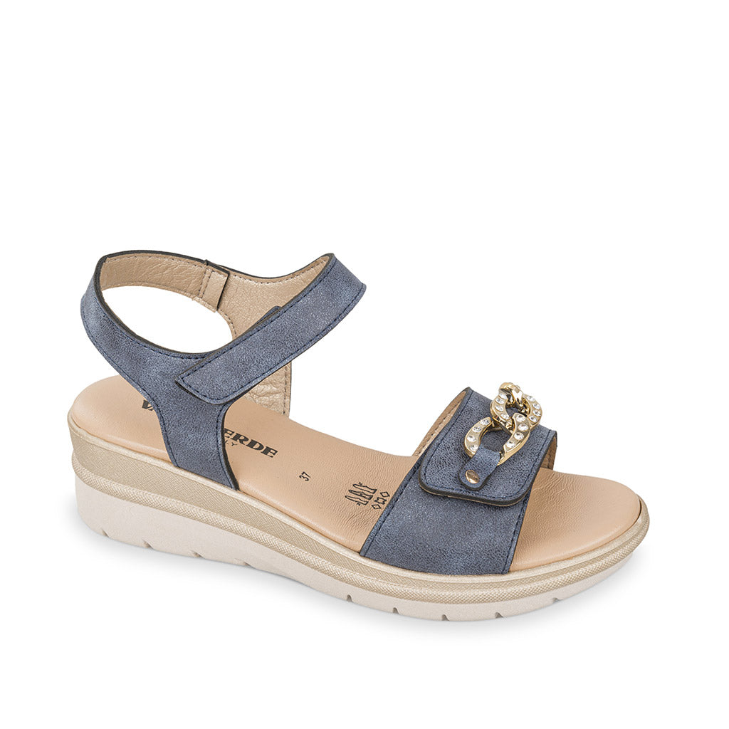 Sandali in ecopelle da donna di VALLEVERDE nel colore blu. Sandali in ecopelle con una fascia con gioielli con apertura a strappo, ed allacciatura a strappo regolabile sul retro, sottopiede in pelle, fondo gomma, tacco cm.5.