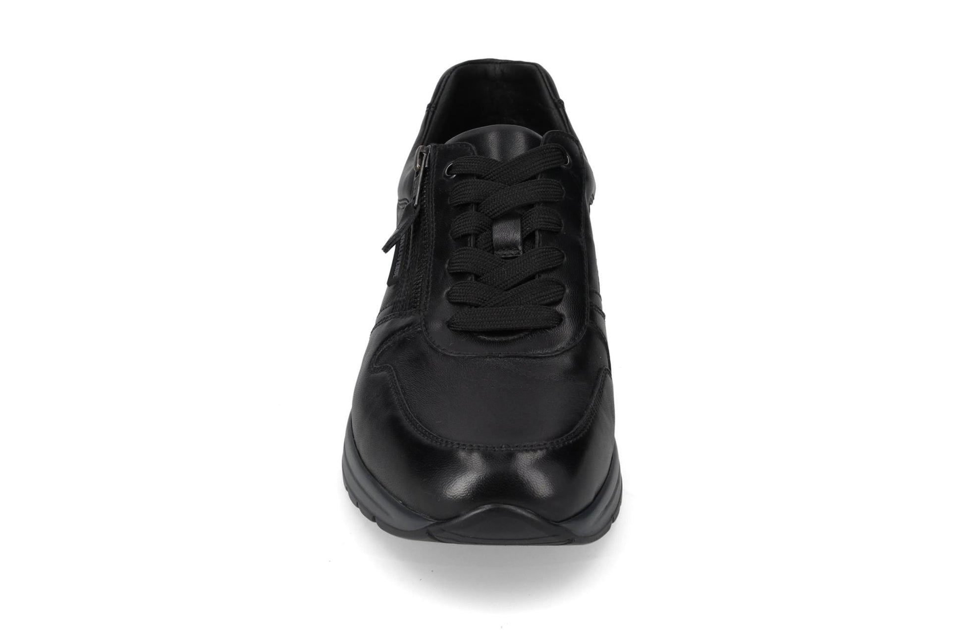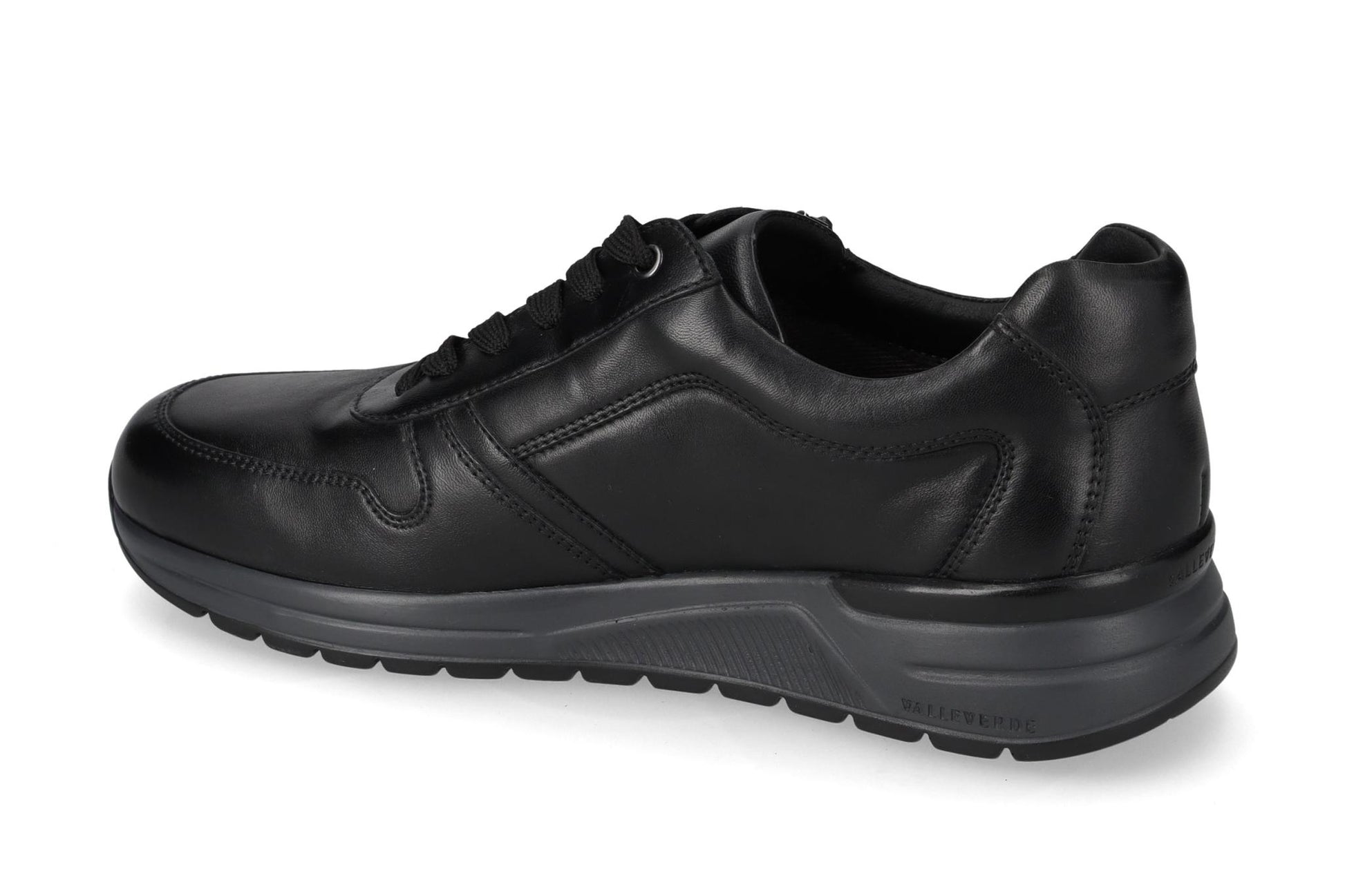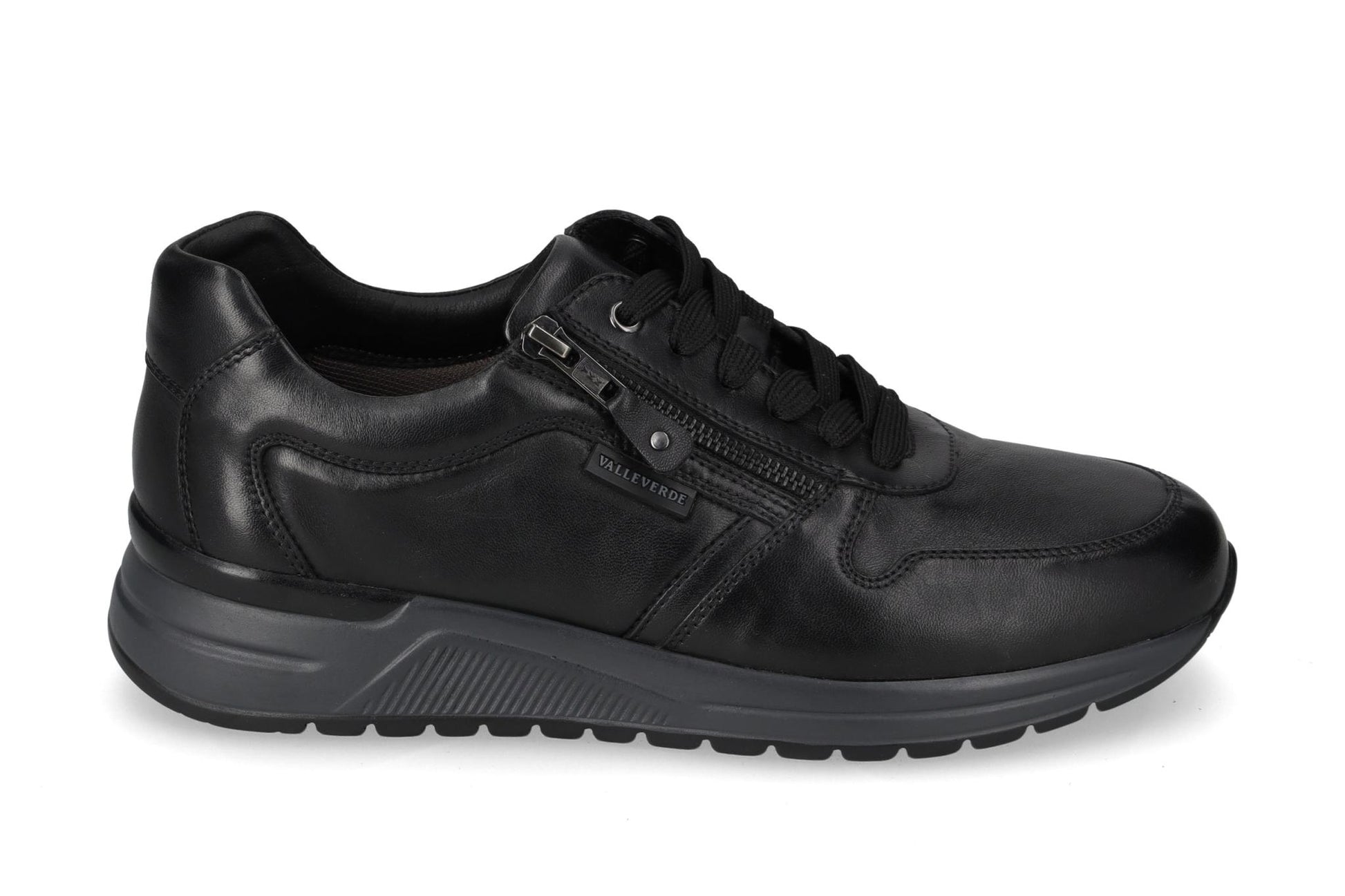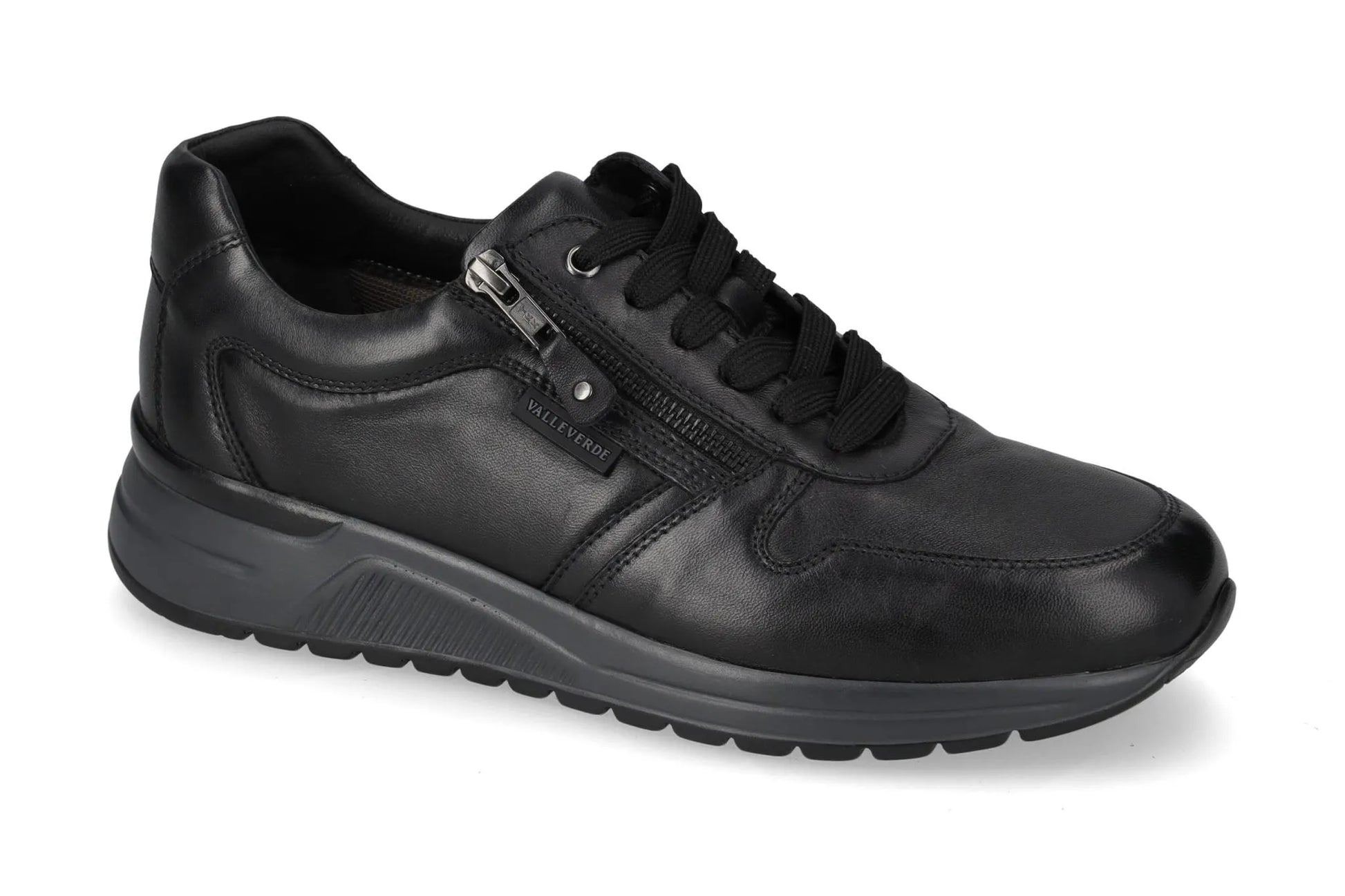 Sneakers in pelle di VALLEVERDE nel colore nero. Scarpe in pelle a 6 fori con apertura centrale e laterale con zip, suola di colore grigio scuro, plantare in vera pelle removibile.