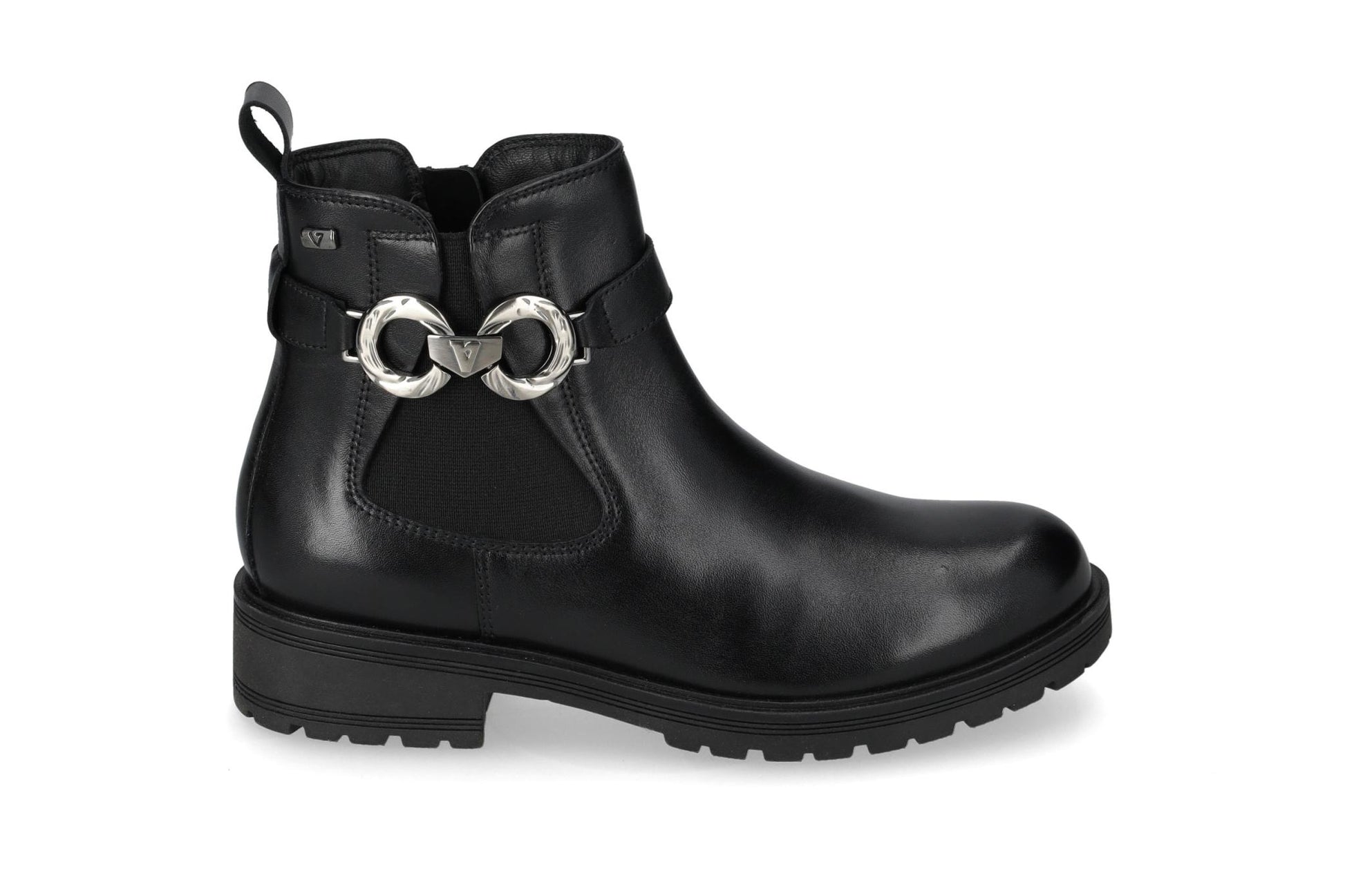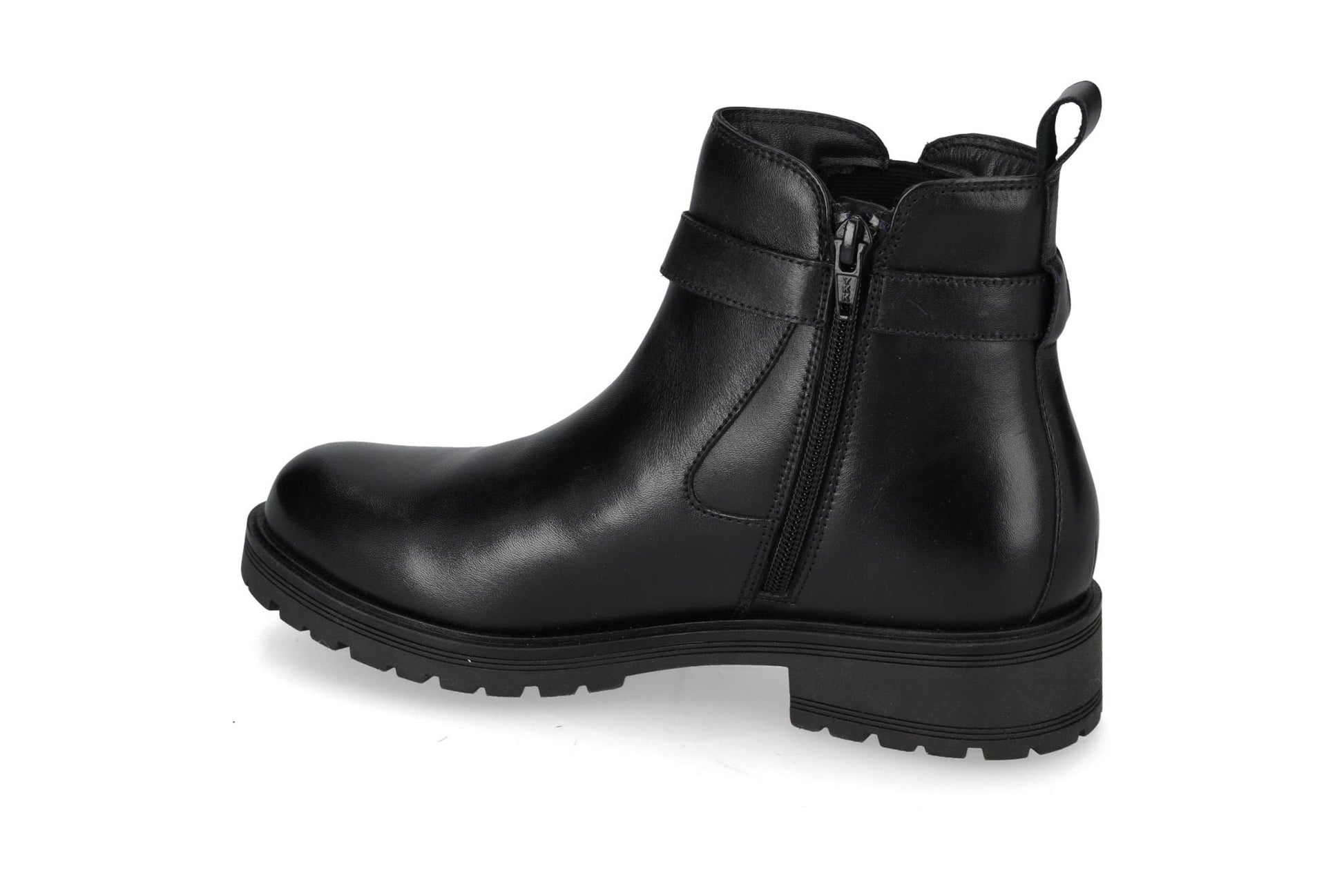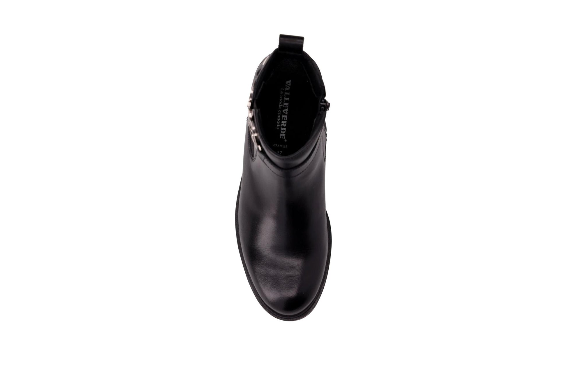 Tronchetto in pelle da donna di VALLEVERDE nel colore nero . Stivaletto in pelle e tessuto con calzata a slipon, suola di carrarmato di colore nero, plantare in vera pelle non removibile.