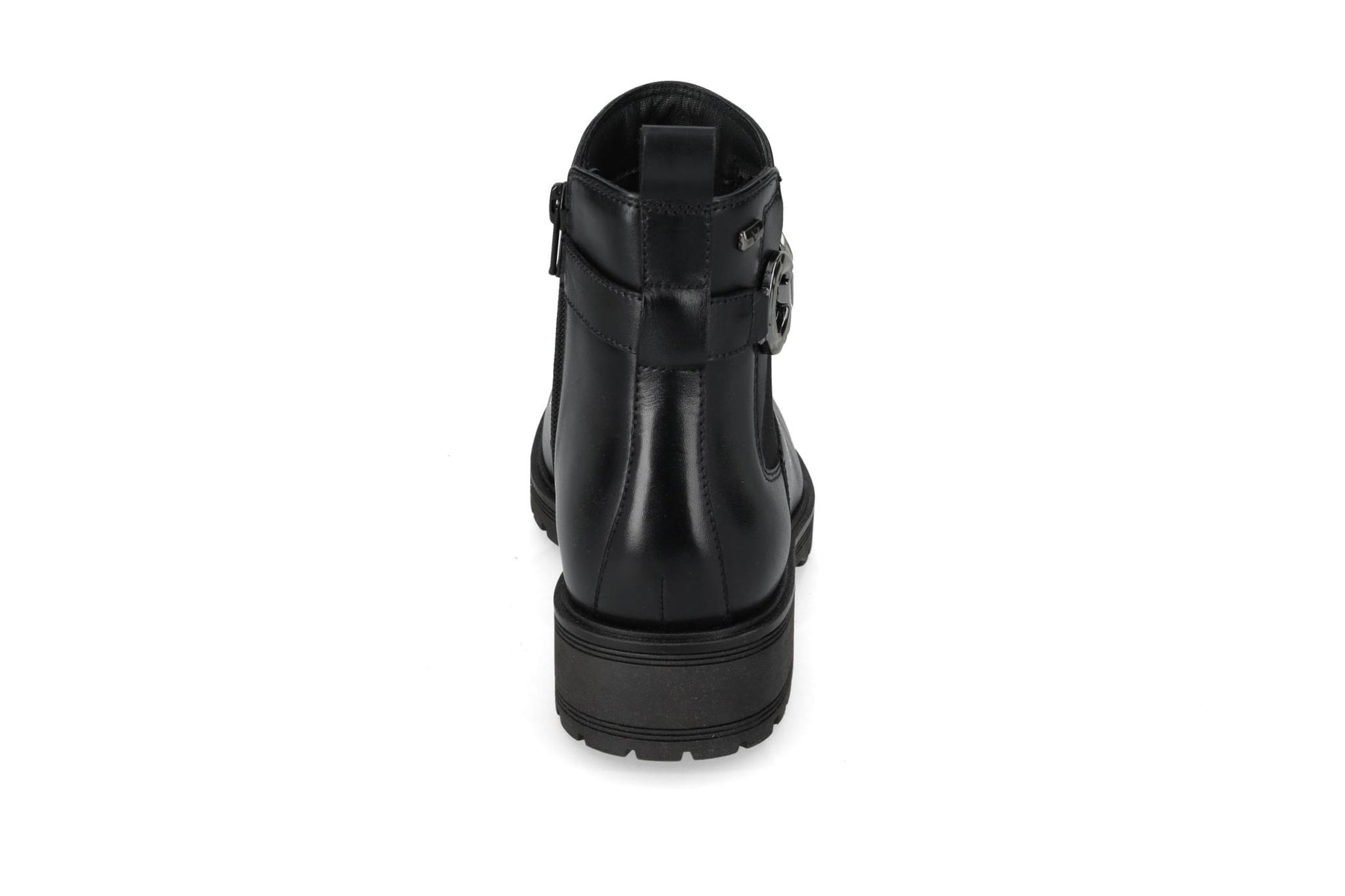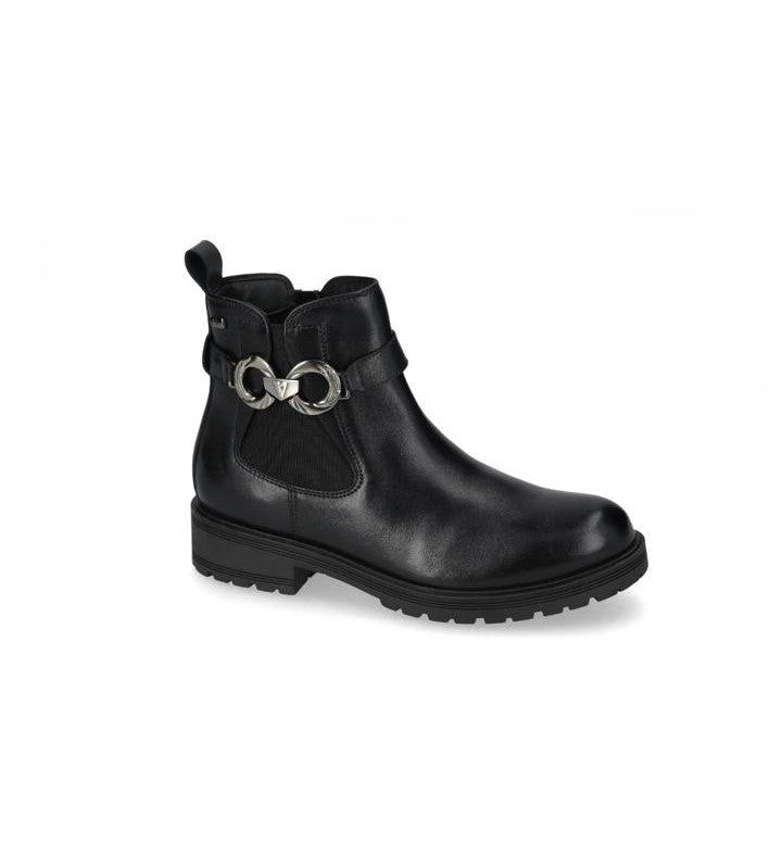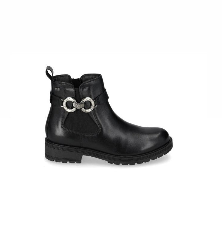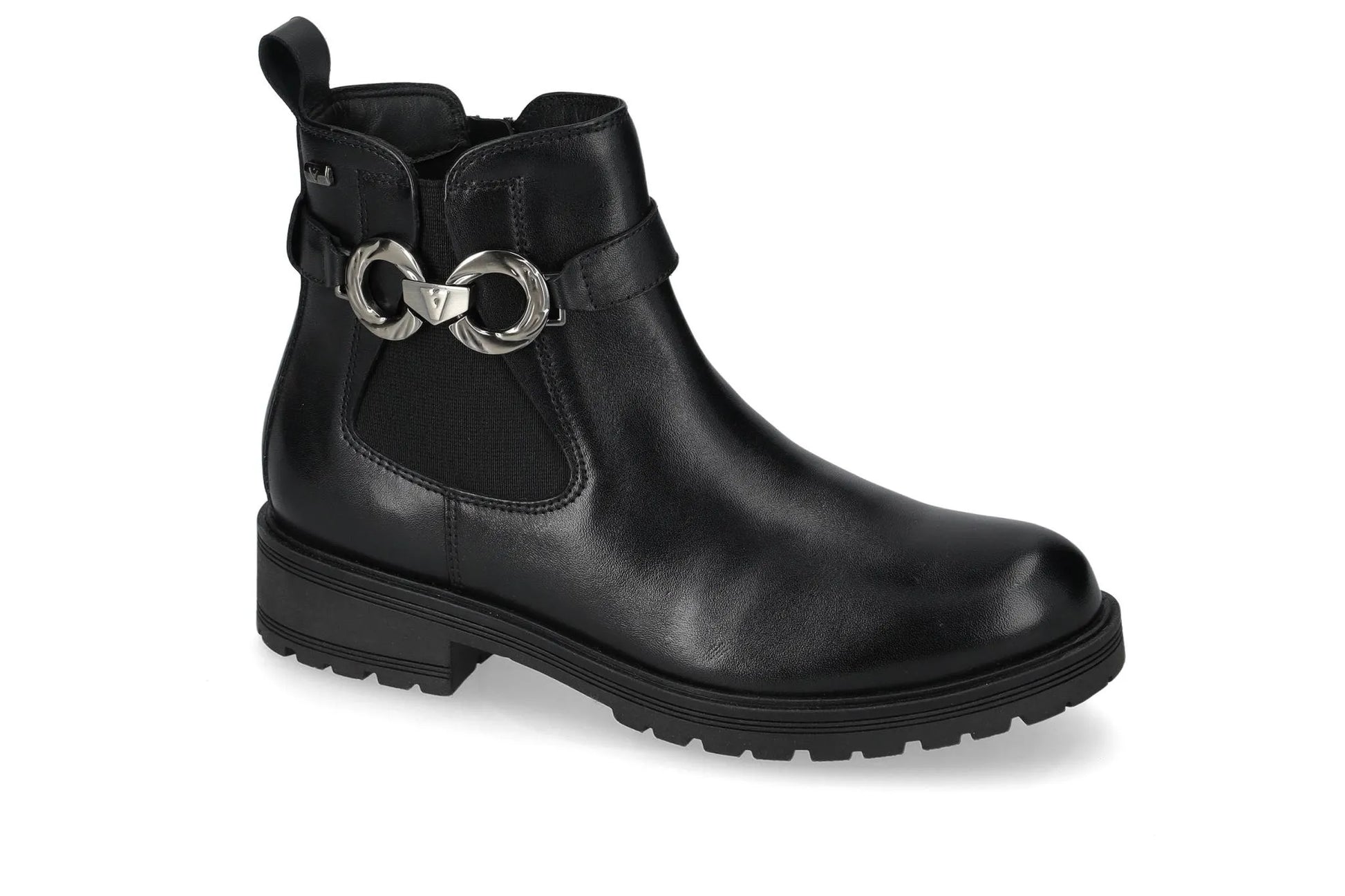 Tronchetto in pelle da donna di VALLEVERDE nel colore nero . Stivaletto in pelle e tessuto con calzata a slipon, suola di carrarmato di colore nero, plantare in vera pelle non removibile.
